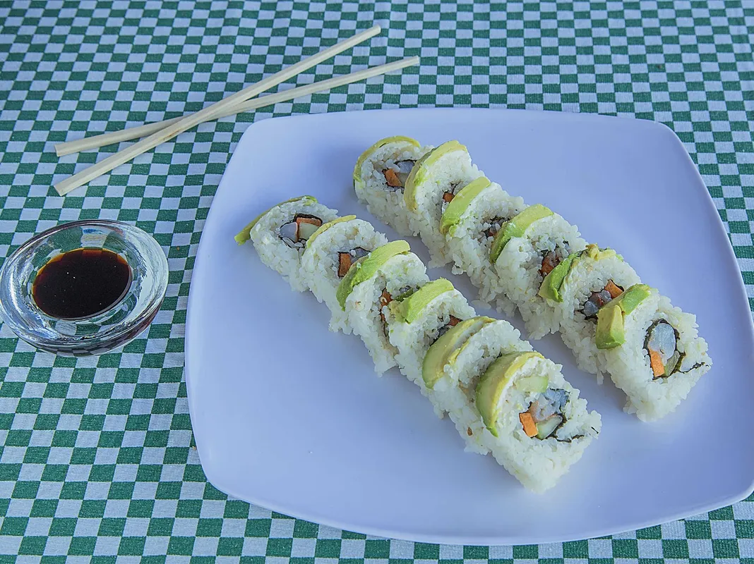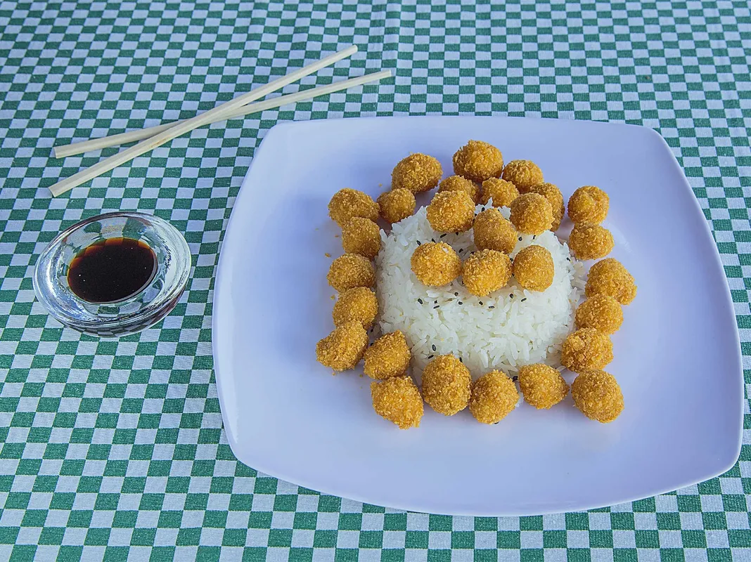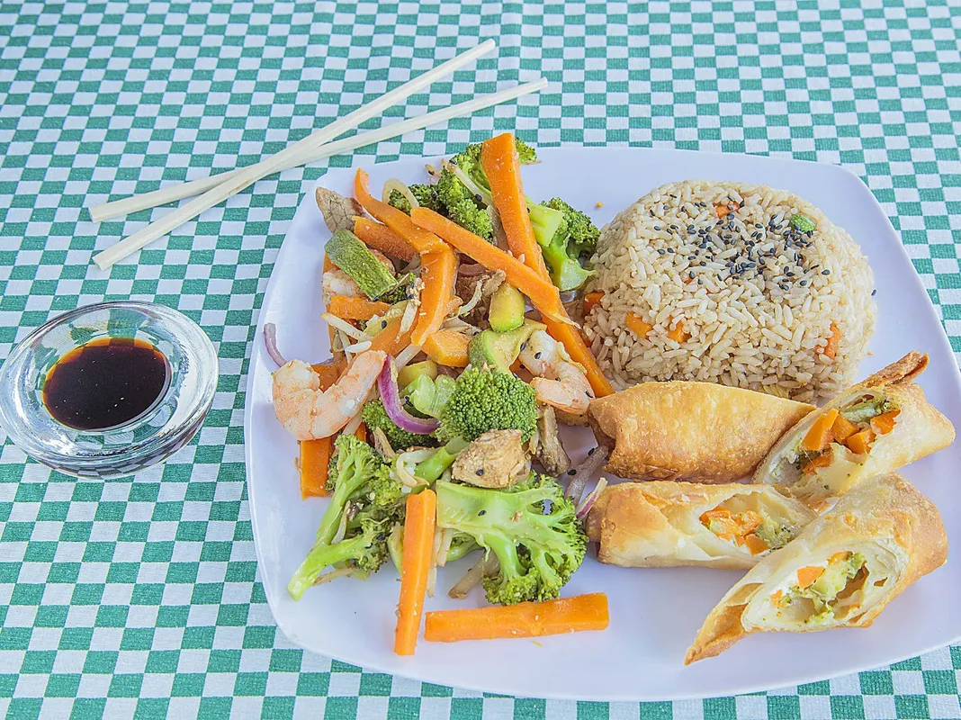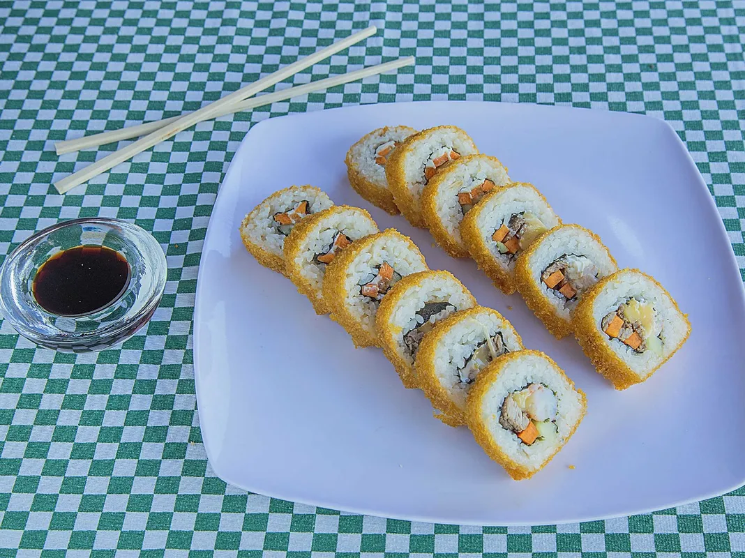 Medio sushi empanizado o philadelphia camarón o surimi una bolita empanizada rellena de camarón y tampico. Elige 1 rollito primavera o yakimeshi. Incluye té helado, agua de jamaica o limón.