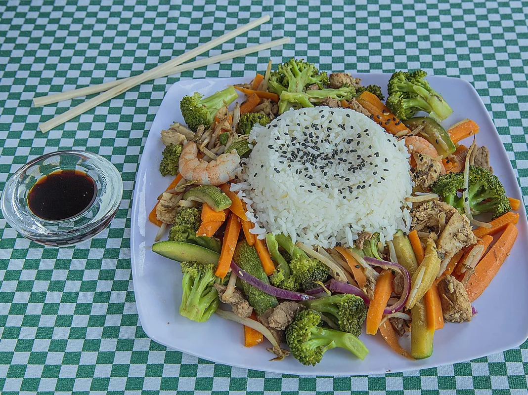 Arroz frito con camarón y philadelphia.
